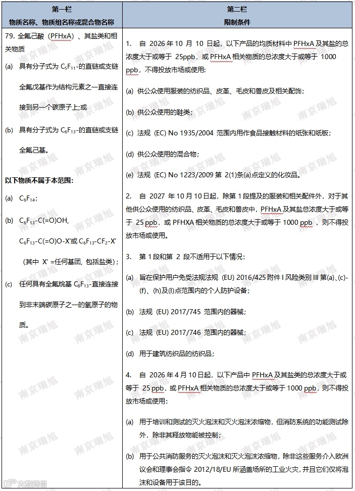 2024年9月20日,欧盟在其官方公报上发布REACH法规((EC) No 1907/2006)修订条例 (EU) 2024/2462,在REACH法规附件XVII中新增第79条关于全氟己酸(PFHxA)及其盐类和相关物质的限制条款。该条款将在欧盟官方公报公布后的第20天(即2024年10月10日)生效。