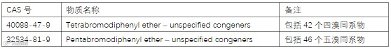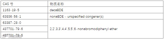 多溴二苯醚(PBDEs)以不可避免的微量污染物的形式存在于物品中,总量等于或小于500mg/kg,包括所有四溴、五溴、六溴、七溴、八溴、九溴和十溴联苯醚同系物;