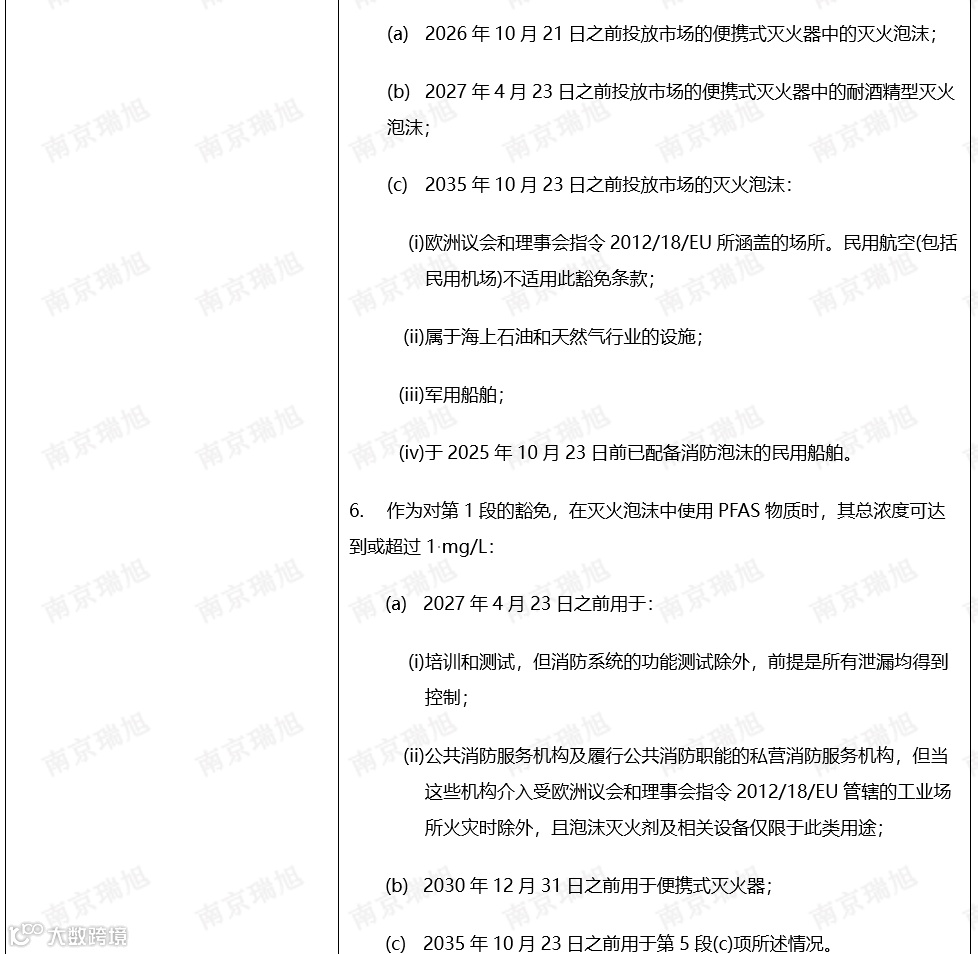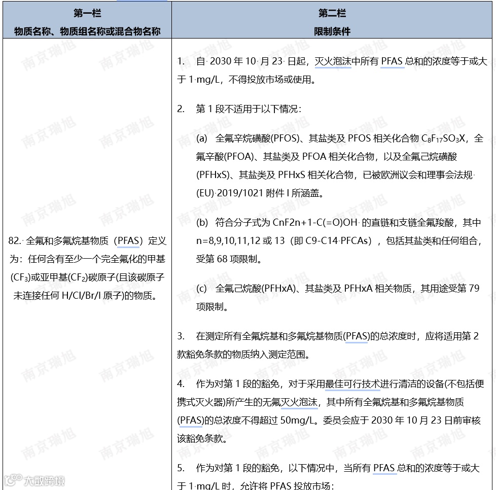 2025年10月3日,欧盟在其官方公报上发布REACH法规((EC) No 1907/2006)修订条例(EU) 2025/1988,在REACH法规附件XVII中新增第82条关于灭火泡沫中全氟烷基物质和多氟烷基物质(PFAS)的限制条款。该条款将在欧盟官方公报公布后的第20天生效。
