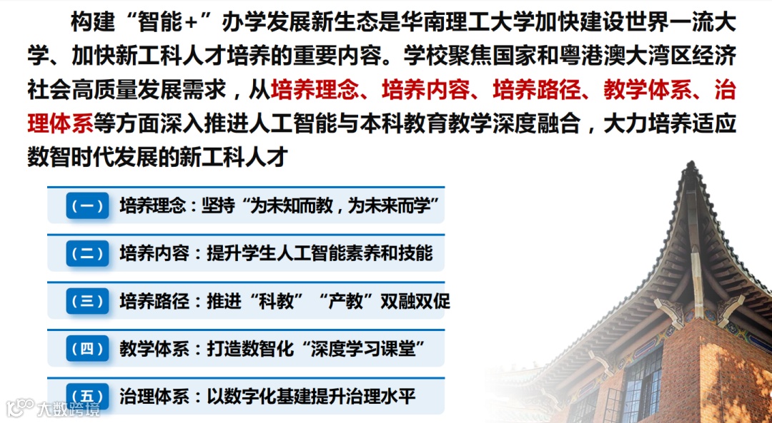 构建“智能+”办学发展新生态,是华南理工大学加快建设世界一流大学、加快新工科人才培养的重要内容。学校聚焦国家和粤港澳大湾区经济社会高质量发展需求,从培养理念、培养内容、培养路径、教学体系、治理体系等方面深入推进人工智能与本科教育教学深度融合,大力培养适应数智时代发展的新工科人才。