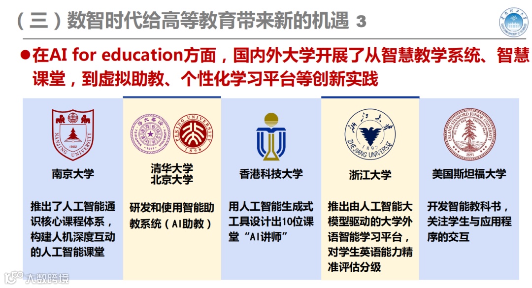 目前,教育部正着力推动教育数字化理念向集成化、智能化、国际化的“3I”转变,将启动实施人工智能赋能行动,促进智能技术与教育教学(AI For Education)、科学研究(AI For Science)的深度融合。在AI For Education方面,国内外大学开展了从智慧教学系统、智慧课堂,到虚拟助教、个性化学习平台等创新实践。在AI For Science方面,AI技术正推进解决基础学科重大科学问题的新范式。例如在2023年度“中国科学十大进展”中,排在第一个的重大进展就是“人工智能大模型为精准天气预报带来新突破”。