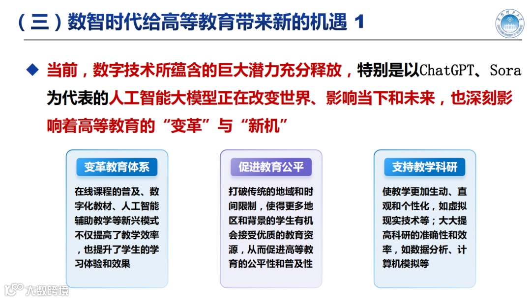 教育数字化转型已经成为全球趋势。近年来,德国、加拿大、欧盟以及部分国际组织不仅先后发布教育数字化、数字教育相关的重要政策,而且数字技术所蕴含的巨大潜力更是充分释放,特别是以ChatGPT、Sora等为代表的人工智能大模型正在改变世界、影响当下和未来,也深刻影响着高等教育的“变革”与“新机”。我认为,人工智能技术对高等教育的影响主要体现在三个方面: