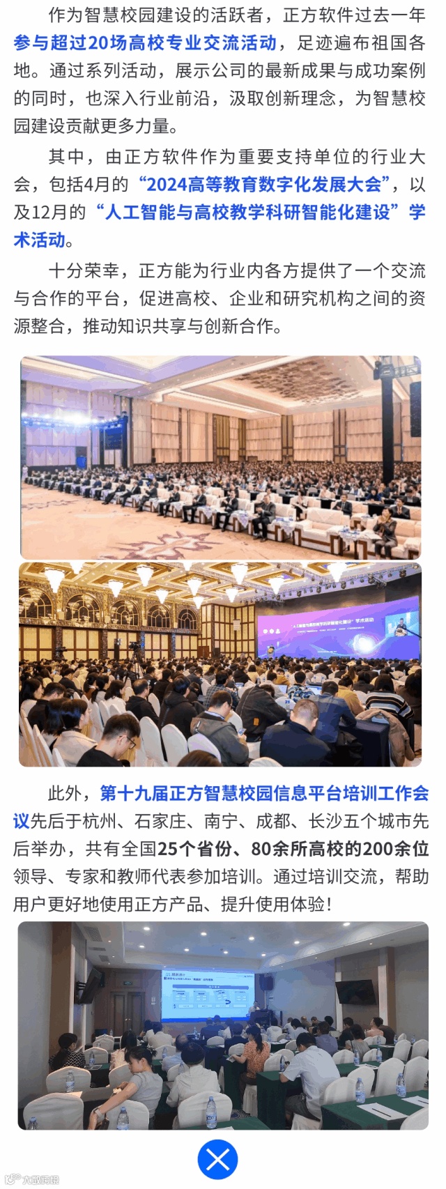回望2024年,科技变革迅猛发展,国际局势风云变幻,数字化转型已成为各行业发展的主旋律。作为高等教育信息化发展的排头兵,正方软件2024年的关键词是:人工智能、智慧教学、智慧管理、行业交流、25周年庆、品牌升级、正方科技园、客户认可。2025年,正方将继续深入探索技术与教育的融合,推动高校数字化建设的持续升级。