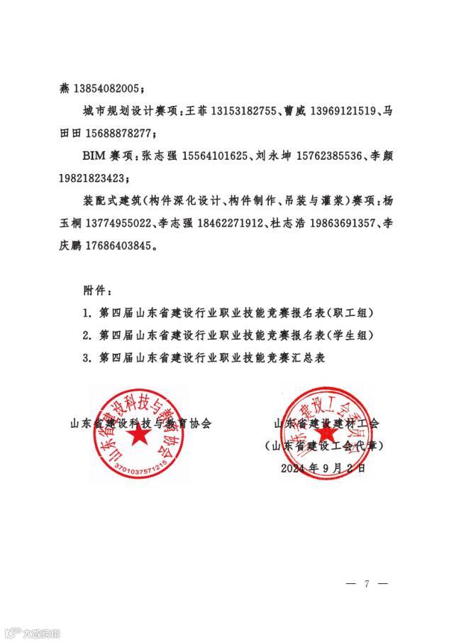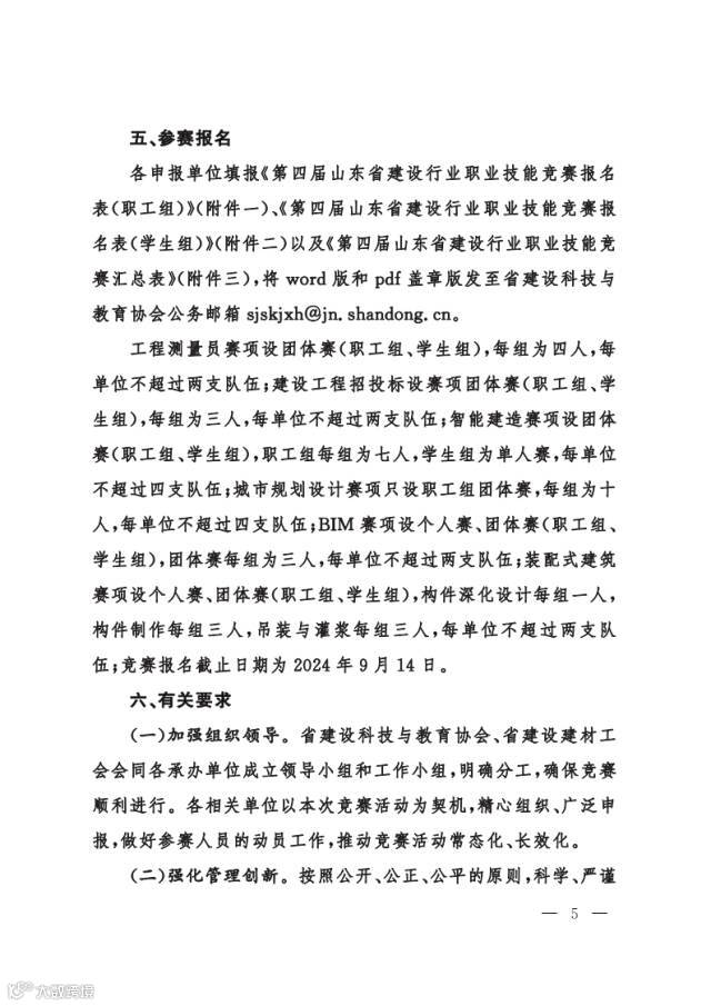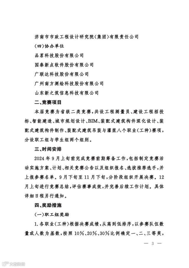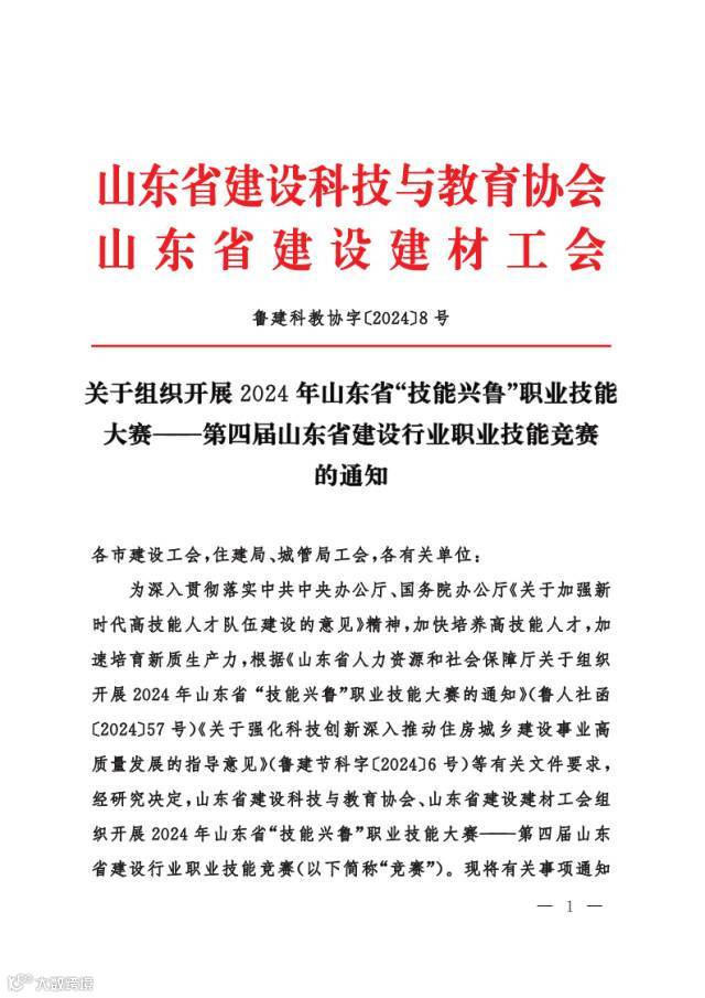 为深入贯彻落实中共中央办公厅、国务院办公厅《关于加强新时代高技能人才队伍建设的意见》精神,加快培养高技能人才,加速培育新质生产力,根据《山东省人力资源和社会保障厅关于组织开展2024年山东省“技能兴鲁”职业技能大赛的通知》(鲁人社函〔2024〕57号)《关于强化科技创新深入推动住房城乡建设事业高质量发展的指导意见》(鲁建节科字〔2024〕6号)等有关文件要求,经研究决定,山东省建设科技与教育协会、山东省建设建材工会组织开展2024年山东省“技能兴鲁”职业技能大赛——第四届山东省建设行业职业技能竞赛(以下简称“竞赛”)。现将有关事项通知如下。