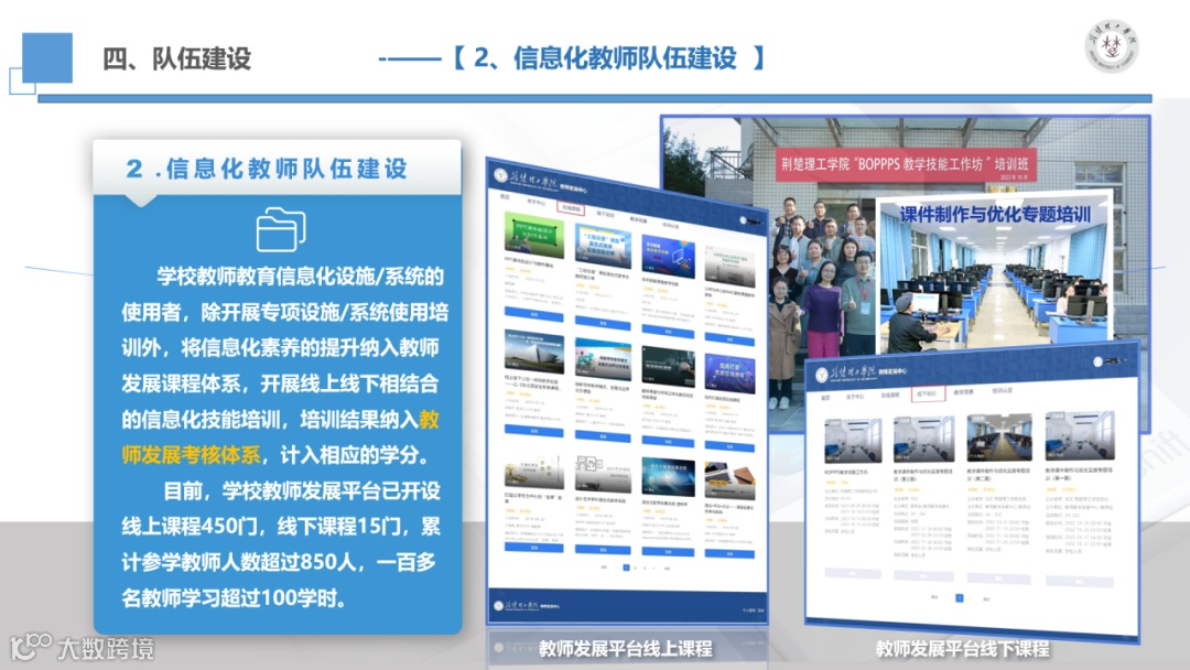4、我国教育信息化建设还在探索过程中,教育信息化的“化”是一个动词,而不是量词,是不断优化、推进的过程。学校领导重视,各个职能部门配合,老师共同努力,就能取得很好的效果。荆楚理工学院对下一步的信息化工作也做了规划,希望得到各位的指导和大力支持,谢谢大家!