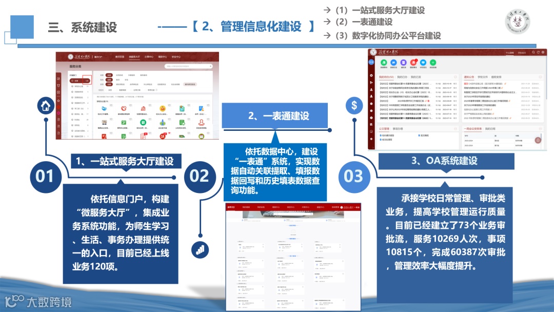 2、管理信息化建设。一站式服务大厅建设,依托信息门户,构建微服务大厅,集成业务系统功能,为师生学习、生活、办公提供统一的入口,目前已经上线业务120项。一表通建设,依据数据中心,建设一表通系统,实现数据自动关联提取、填报数据回写和历史填表数据查找,承建学校日常教学管理,提高管理运营质量,建立了73个业务审批流程,实现了无纸化办公,构建覆盖高校管理全业务的信息化系统,一站式学生社区也联网进行。