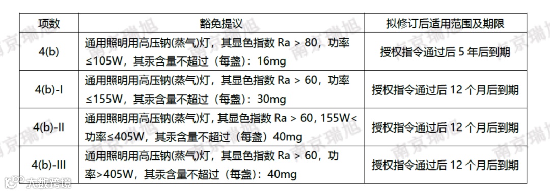 此法规草案将更新附件III第4(b)项的豁免条款内容,更新后的豁免拟于授权指令通过5年后到期,第4(b)-I至4(b)-III关于通用照明用高压钠(蒸气)灯中汞的3项豁免的续期申请均被驳回。法规草案拟给与第4(b)-I至4(b)-III项豁免12个月的过渡期。适用于该条豁免的高压钠(蒸气)灯在过渡期后,将不再适用相关豁免,而应严格执行RoHS2.0的限量要求。