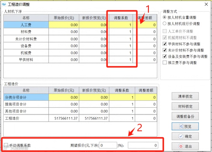 在弹出的对话框中,可以点击1框处将整个工程的人工、材料、机械乘以调价系数,也可以勾选【手动调整系数】后在后面的输入框中填入下浮百分比。