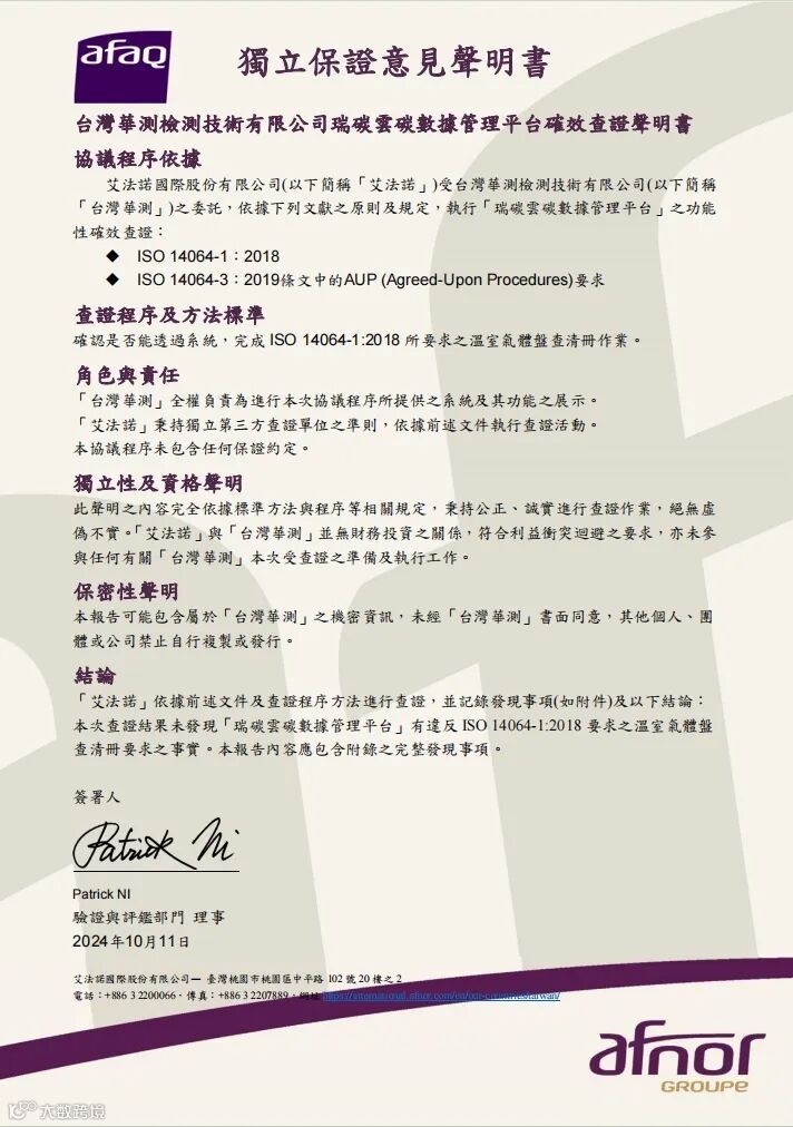 近期,瑞旭集团自主研发的瑞碳云系统通过其合作伙伴台湾华测检测技术有限公司,成功获得了法国标准协会艾法诺国际股份有限公司(AFNOR)的碳管理软件认证。该认证符合国际标准ISO 14064-1:2018和ISO 14064-3:2019,这标志着瑞碳云系统自其全球排放源数据库上线以来的又一重要成就。