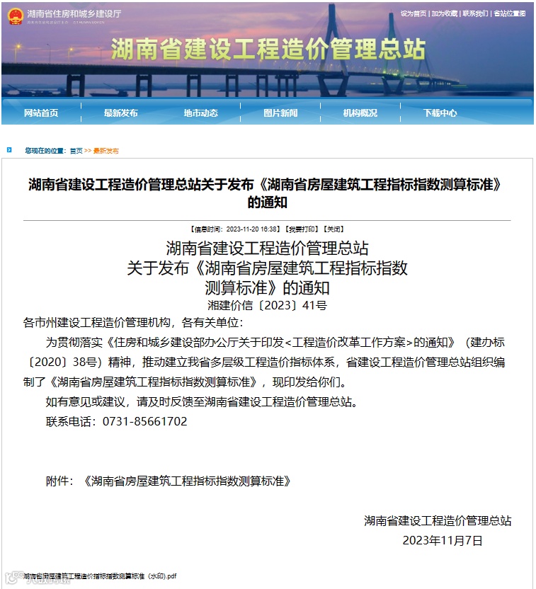 为贯彻落实《住房和城乡建设部办公厅关于印发<工程造价改革工作方案>的通知》(建办标〔2020〕38号)精神,推动建立湖南省多层级工程造价指标体系,湖南省建设工程造价管理总站组织编制了《湖南省房屋建筑工程指标指数测算标准》(以下简称该标准)。