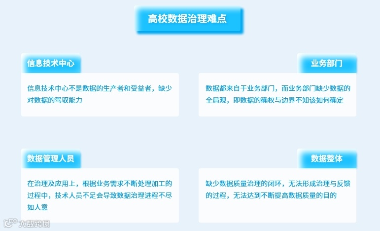 对于信息技术中心、业务部门、数据管理人员以及数据整体而言,各种角色面临不同的业务难点。例如,作为数据管理角色的“信息技术中心”,并不直接生产和使用数据,对上下游业务部门数据的管控有限。不同角色针对不同难点的处理成效不一,致使数据质量提升困难,最终难以达到数据治理和不断提高数据质量的目标。