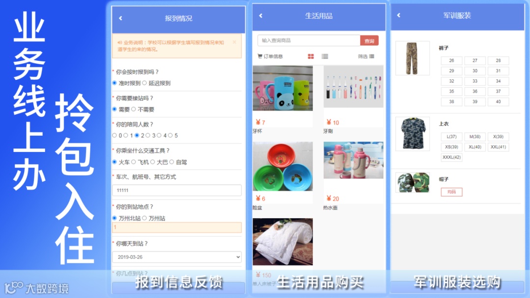 学生信息完善、财务缴费、绿色通道、报到计划采集、网选宿舍、宿舍生活物品采买、军训服装尺码选择等等。