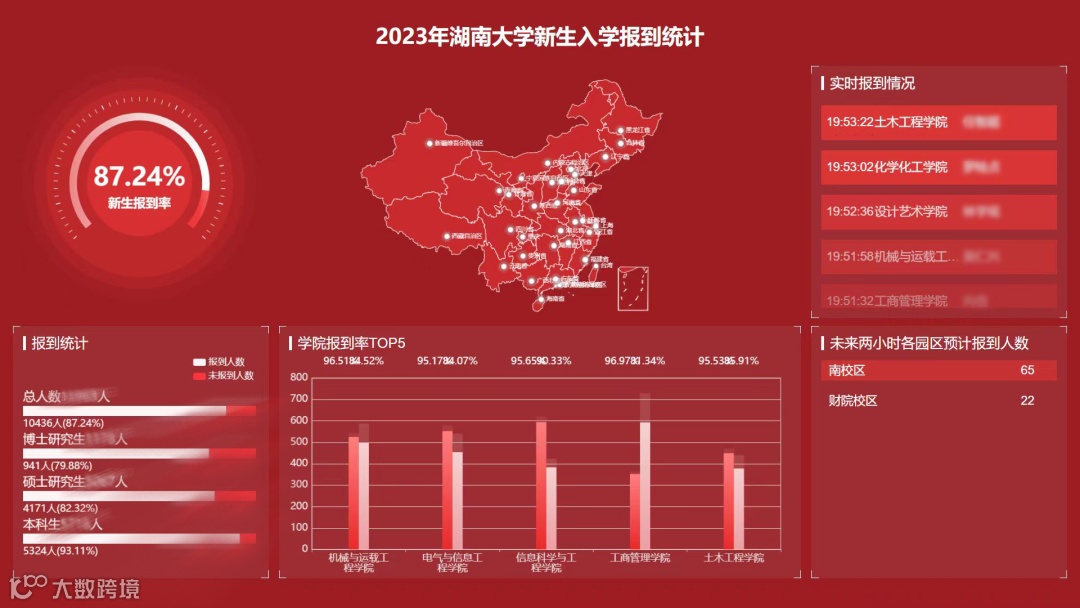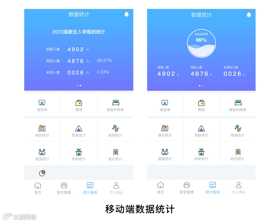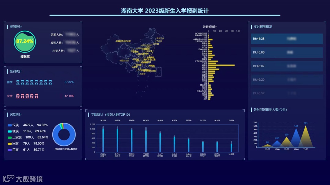 学校和院系可以将温馨提示、新生个性数据、实时报到进度等信息展示在报到现场大屏中,不仅方便各院系、校领导查看进度,也能增强现场迎新氛围。在迎新工作结束后,系统还能自动生成院系、学校两级的新生数据分析,包括生源省份、年龄、性别、爱好、专业、报到数据等,方便学校传播增强新生的归属感。