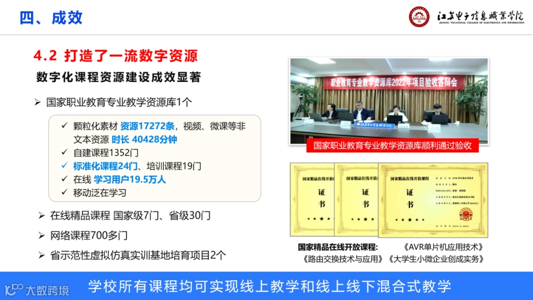 二是打造了一流数字资源。建成了国家职业教育专业教学资源库1个,在线精品课程国家级7门、省级30门、网络课程700多门,省示范性虚拟仿真实训基地培育项目2个。现在学校所有课程均可实现线上线下混合教学;打造了一批特色资源库。淮安是周恩来总理的故乡,我们建成了淮安地域文化特色数字博物馆、周总理故居数字化展示厅,推进文化传承与科技创新结合;数字化教材资源建设成果丰硕,获得首届全国教材建设奖优秀教材2部,十四五职业教育规划教材国家级17部、省级11部,省重点教材18部,校企合作教材116部;数字资源共享取得明显突破,1个国家级、6个校级资源库等等一系列课程接入国家职业教育智慧教育平台。学校数字资源充分放大了我们学校的品牌效应。