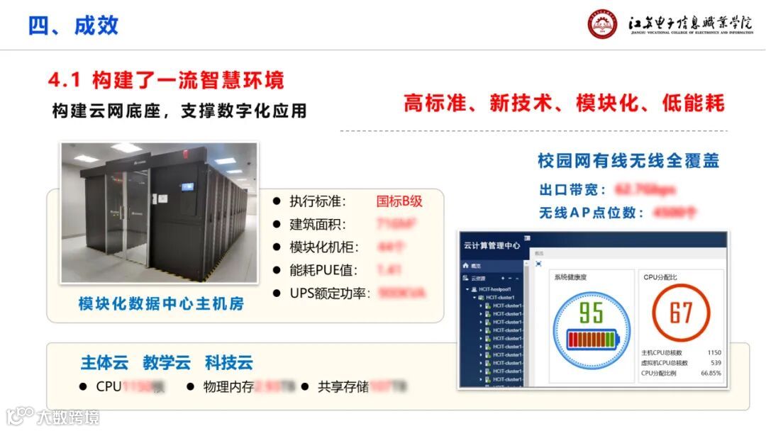 一是构建了一流智慧环境,按照国标B级建成了校园网、机房和云计算中心,校园有线无线全覆盖,云网底座效果非常好;构建智慧教学空间,实现了所有公共教室智慧化,覆盖到160间教室,实现了教学组织信息化、教学评价数据化。总体来讲设施齐全,技术先进,利用率高,有效地赋能了教育教学改革;构建一批虚实结合的实训基地,包括江苏省工业互联与电子信息产品智能制造产教融合集成平台、全国工商联产教融合示范实训基地等,大大提升了学生的实训技能;构建了三级(校园出入口及周界、内部主要区域、学生公寓宿舍)智慧安防,打造平安校园。