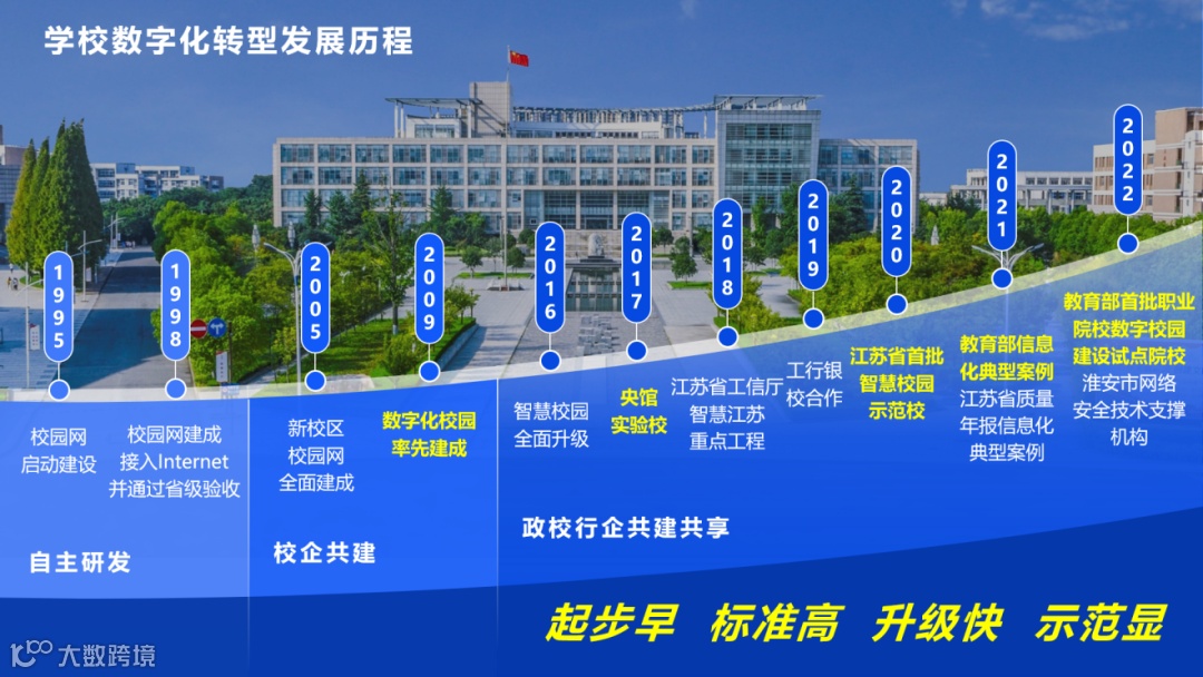 学校数字化转型发展经过了3个阶段、11个节点,其中有几个节点是比较重要的:1995年启动了校园网建设、1998年校园网建成、2009年数字化校园在全省率先建成、2016年智慧校园全面升级、2017年通过央馆实验校验收、2018年拿到了江苏省工信厅“智慧江苏”重点工程项目、2020年通过江苏省首批智慧校园示范校验收、2021年成为教育部信息化典型案例、2022年获得了教育部首批职业院校数字校园建设试点院校。我校数字校园建设起步早、标准高、升级快、示范显。