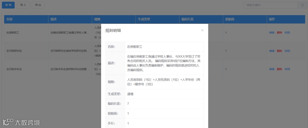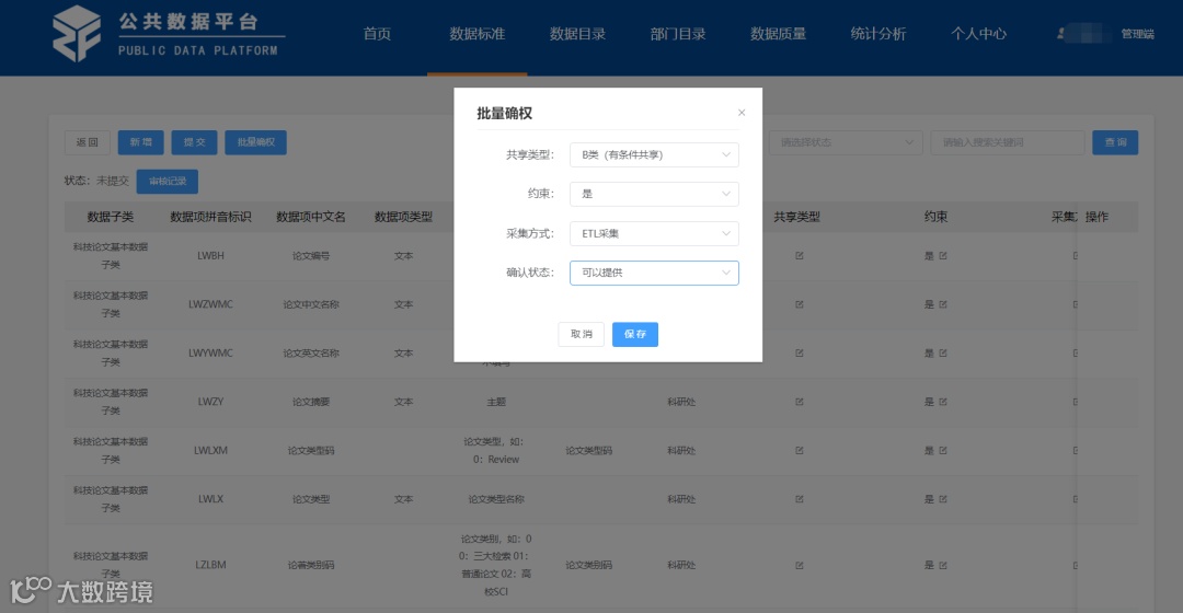 本平台根据全校各个部门关于数据来源的权责要求,实现由各业务来源部门在线一键完成各类数据子类字段级及代码表行级的确权,包括数据类型、数据长度、数据约束、业务解释/举例、引用格式、采标情况、值空间、共享类型、更新频率、权威源等信息;各业务来源部门能基于数据子类或代码表的数据预置标准分配二次确权责任人,各确权负责人完成数据标准确权,并经各业务来源部门主管领导、信息部门数据管理员及信息部门主管领导审核后,形成校信息标准初稿(完成数据标准发布),并在后续数据集成和数据应用服务的推进过程中,逐步完善校数据标准,构建数据标准建设的闭环管理体系。