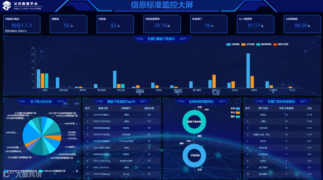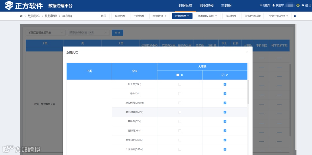 数据标准包括编码标准、基础/通用数据类标准、国标/行标/部标、预置校标、校执行标准、校标UC矩阵预置分发、校标确权、校标确权审核、校标确权分析等功能;