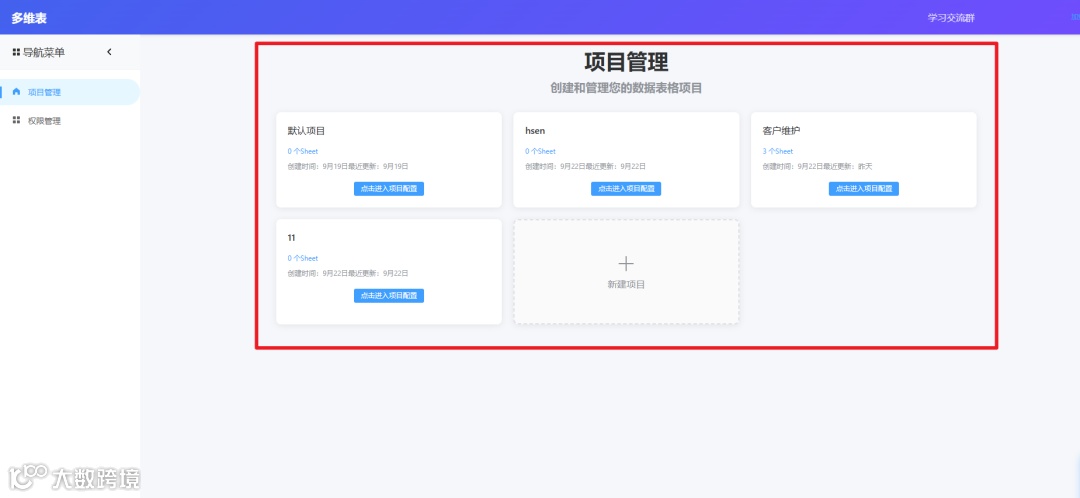 (1)可进行项目管理,在项目管理中配置不同类型多维表