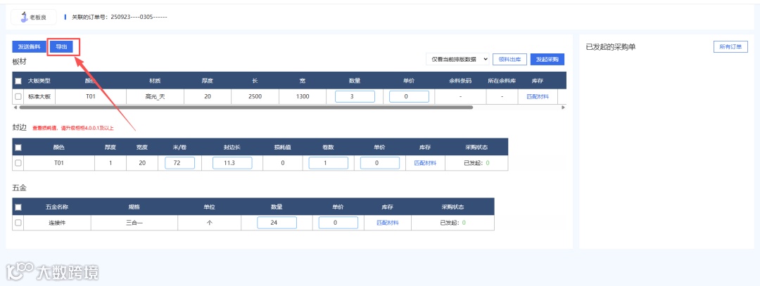 5、没绑定老板良账号的进入柜柜的采购单,增加了导出按钮