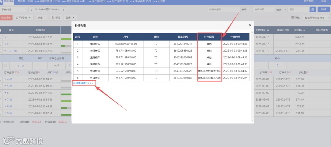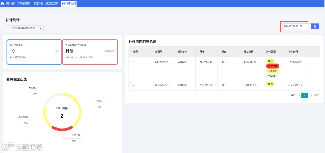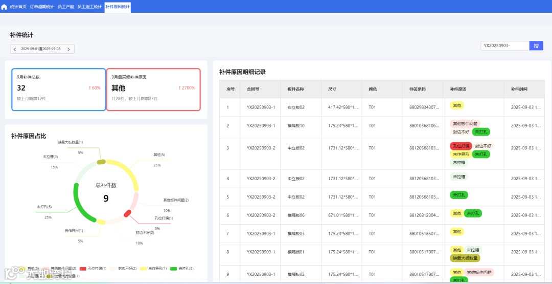 (2)右侧为补件原因明细记录,包含字段为:序号、合同号、板件名称、尺寸、颜色、标签条码、补件原因、补件时间,其中补件原因与环形图中的颜色一一对应