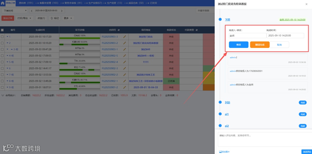 点击完成人完成时间数据,跳出内联表单,可修改完成人与撤回完成