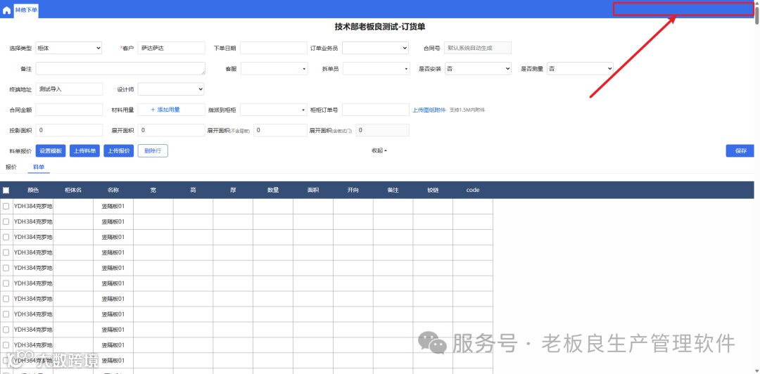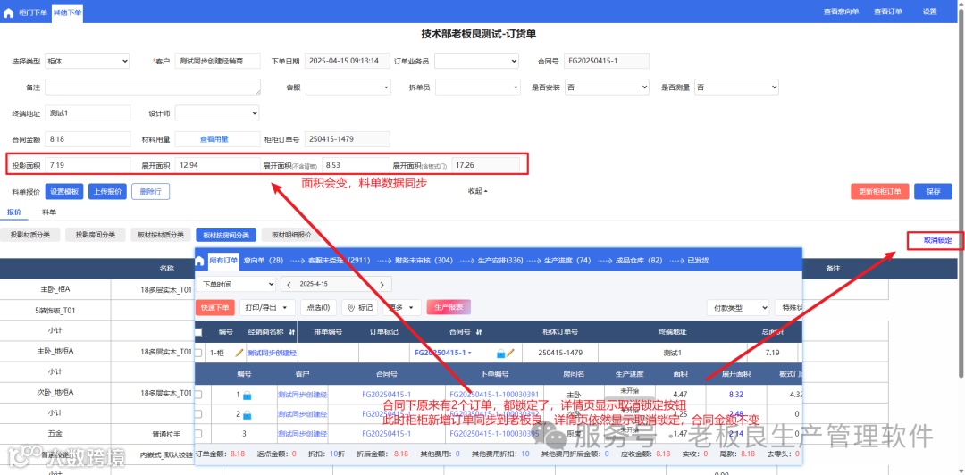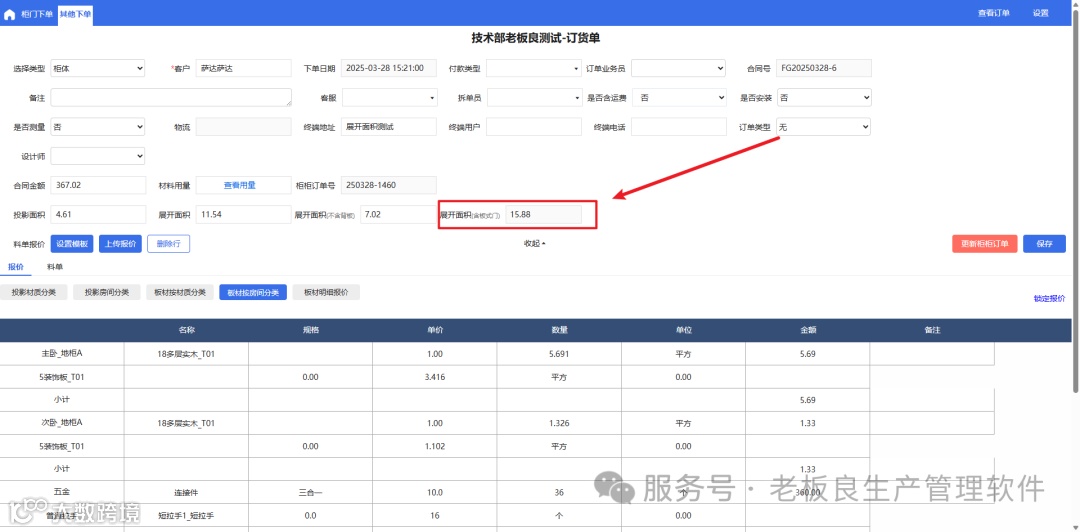 柜体订单详情增加“展开面积(含板式门)”,显示柜体订单含板式门的展开面积,不支持修改