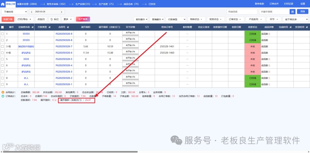 所有订单底部统计增加“展开面积(含板式门)”,筛选后统计筛选结果中的数据