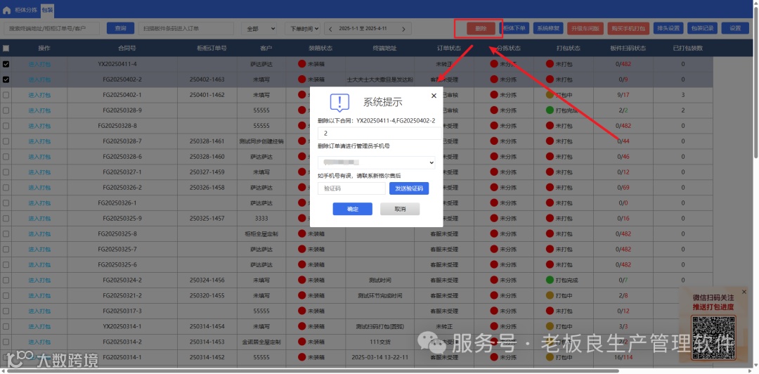 勾选合同-删除,输入原因,验证管理员手机号,验证成功即可删除
