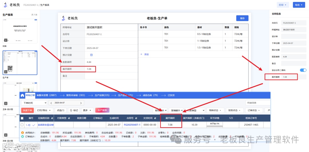 2、所有订单-生产报表-生产单增加“展开面积”,取合同展开面积