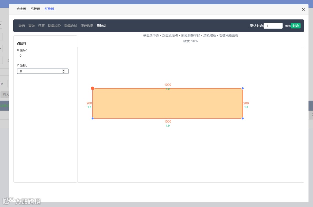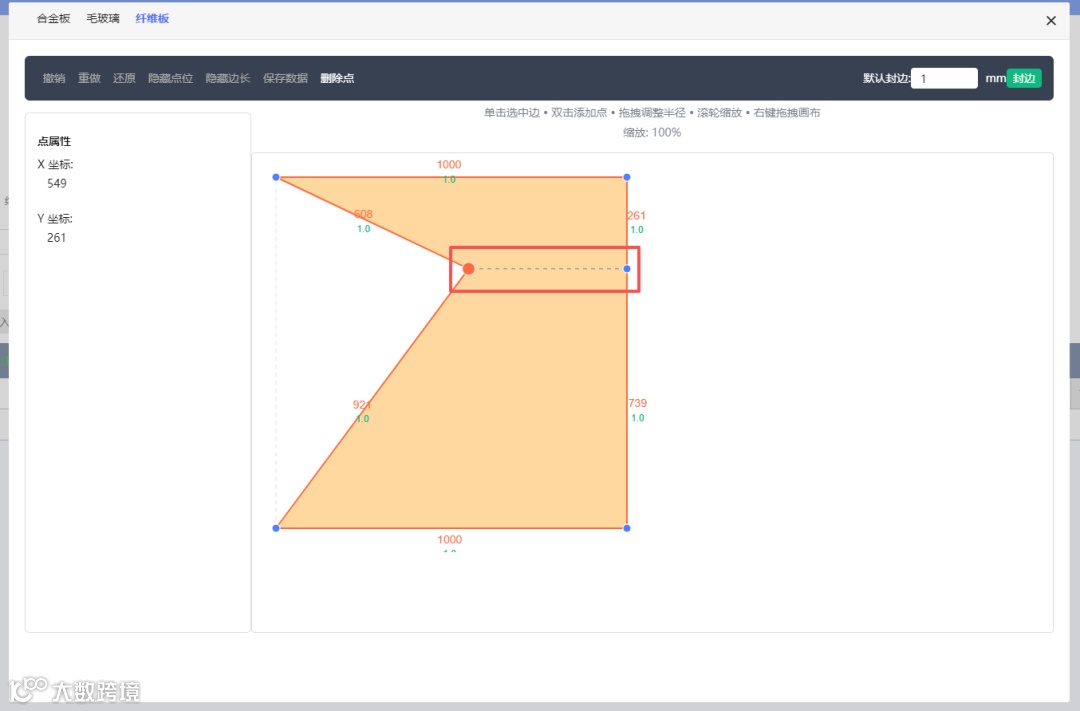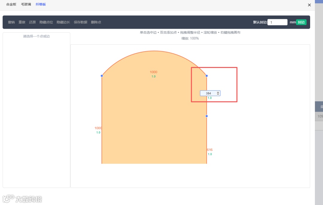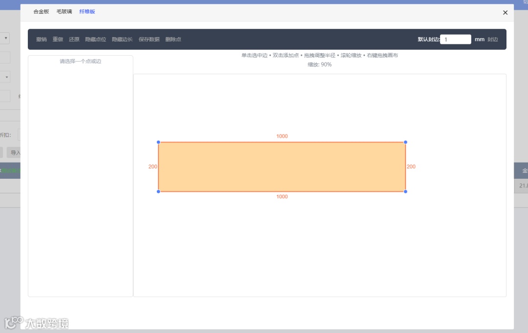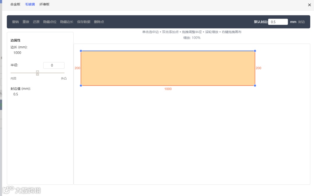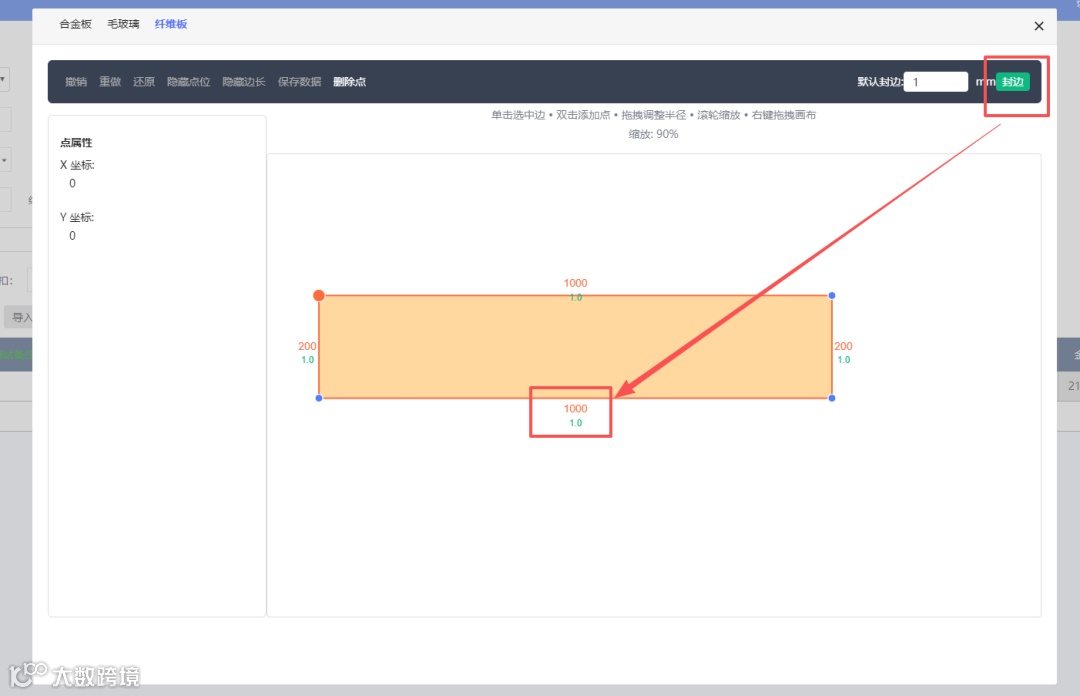 点击”封边”按钮: 切换画布上显示边长或封边值,激活时按钮变绿色,边也会显示封边值