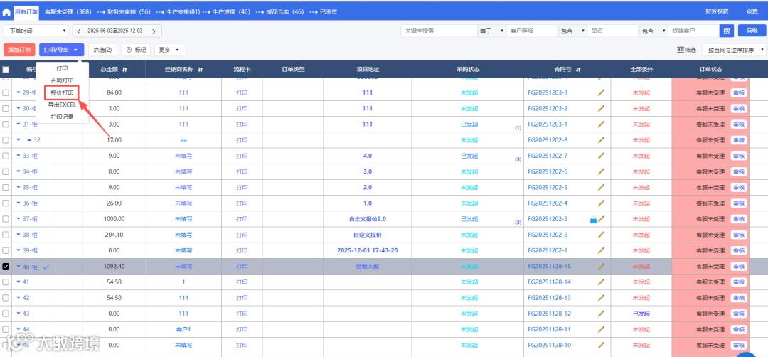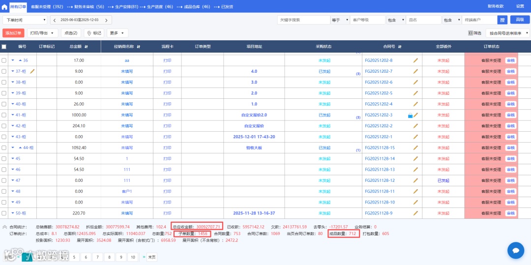 3、全屋版本所有订单页面增加 总应收金额、子单数量、成品数量 三项统计