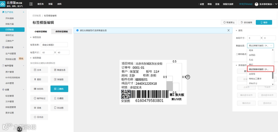 云排版标签编辑增加 易达装备对接码(#取下单格式)