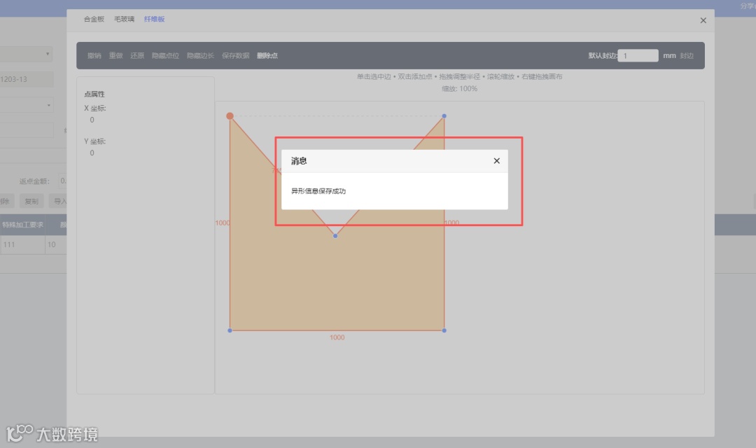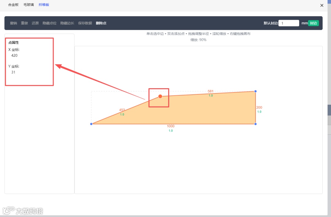 左侧: 编辑操作按钮(撤销、重做、还原、隐藏点位、隐藏边长、保存数据、删除点)