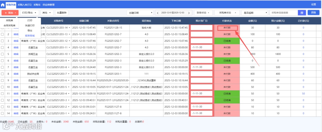 从材料用量发起采购单,将不用再进行二次编辑才能将收款状态变为未付款