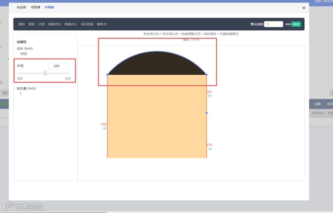 拖拽半径,控制边线弧度: 调整边的弧度值,向外拖拽为外凸,向内拖拽为内凹