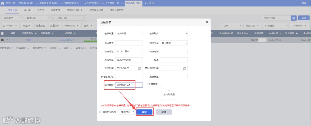 2、合并发货新增送货地址,自动回填下单时填写的送货地址