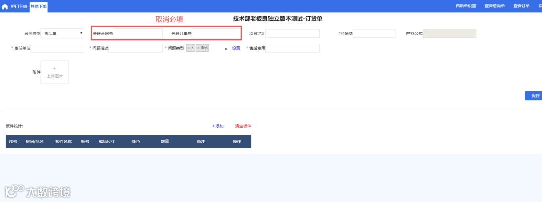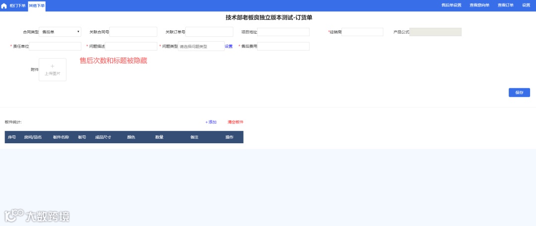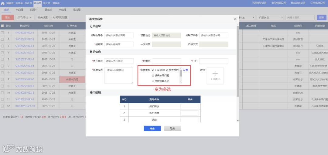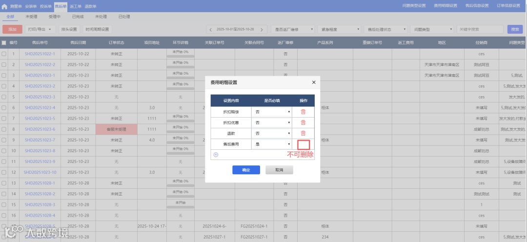 (4)售后单设置数据同步售后管理中的售后信息设置和售后费用设置的对应字段的相关设置:比如说售后次数在售后管理中设为必填,则下单处也为必填