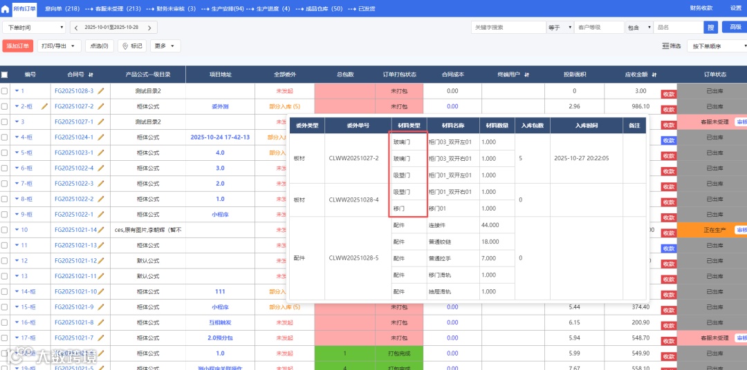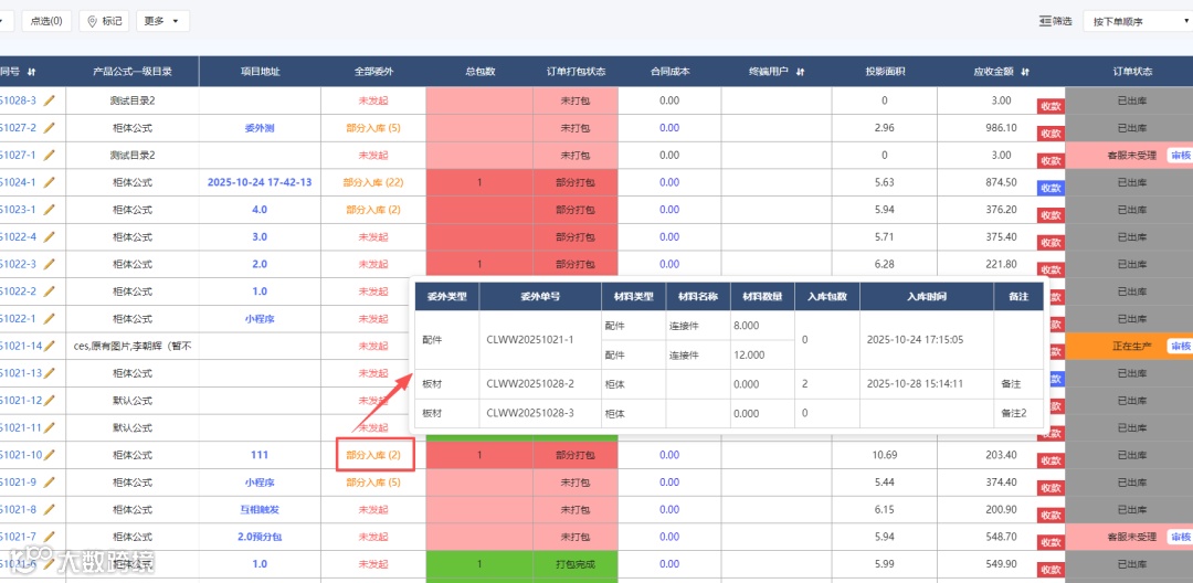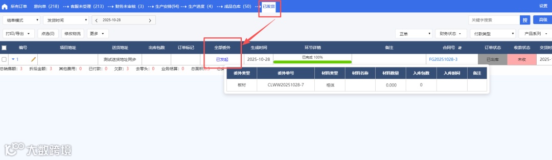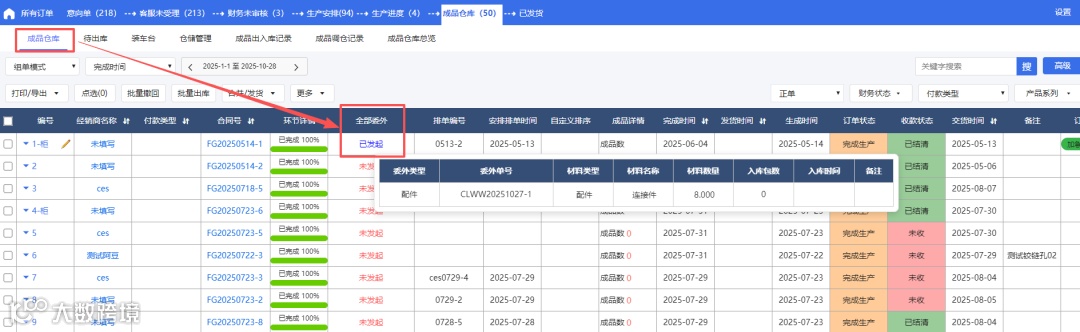 2、成品仓库、待出库、已发货的组排头增加【全部委外】的排头,鼠标悬浮均可查看数据