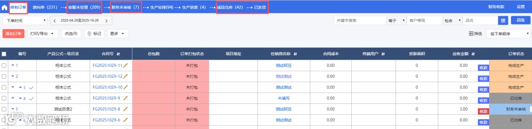 所有订单、客户未受理、财务未审核、成品仓库、已发货页面,订单表格数据默认查询时间段新增【默认日期最近半年】