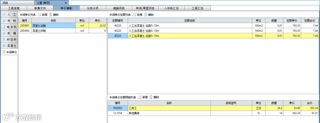 2)中间单价:可自行设置多条拌制运输定额并在插入混凝土定额时调用。