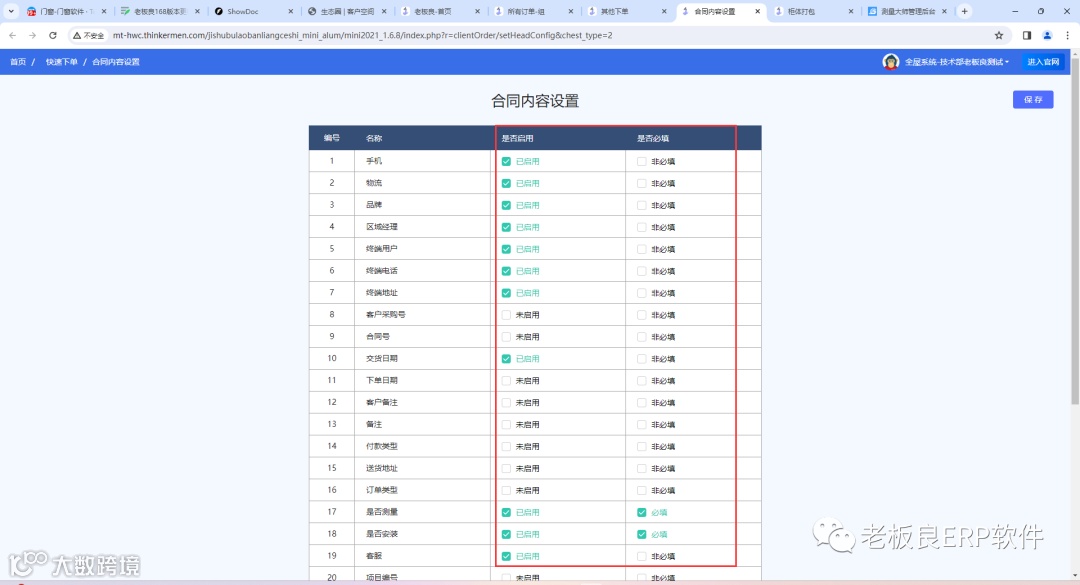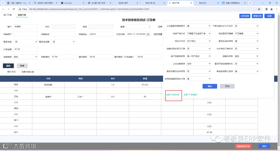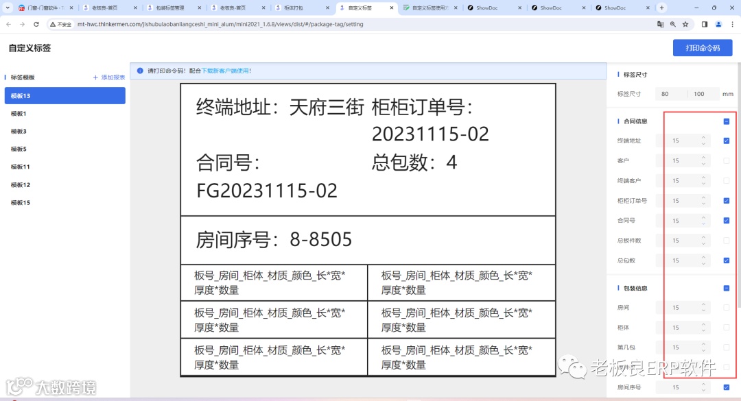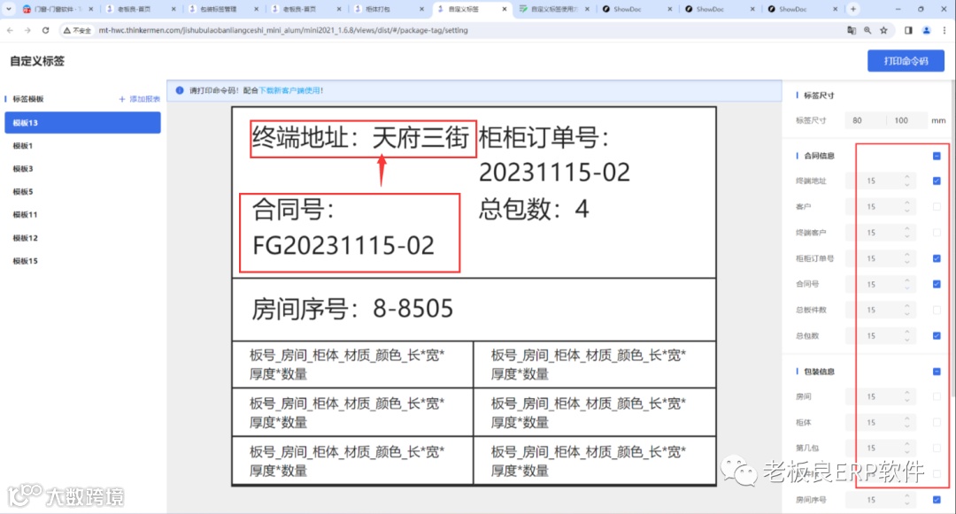 3、底部的合同信息、包装信息、板件信息可以自定义勾选是否需要,可以调整数值来加大字号的展示