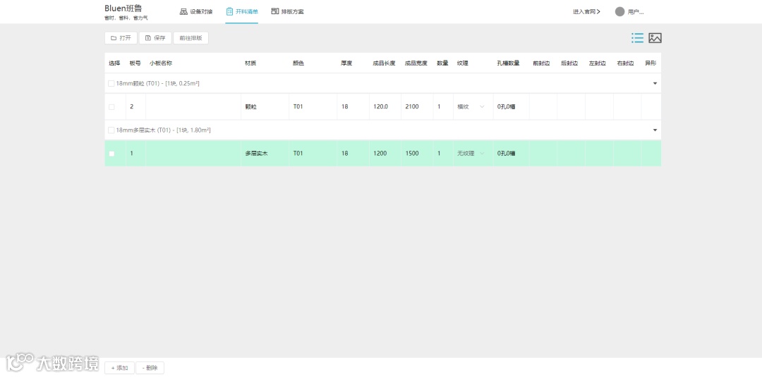 1、WEB班鲁开料清单板件参数设置。可在开料板件中选择不同类型板件进行开料。