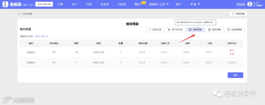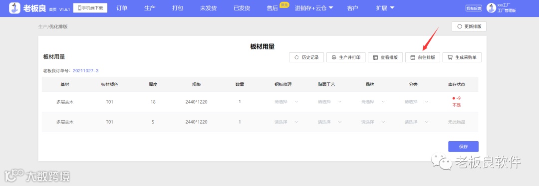 1、在板材用量中点击前往排版,即可进入班鲁最新的开料清单中。