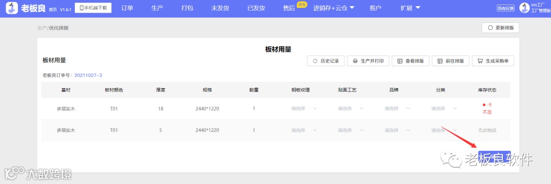 (1)通过班鲁WEB的排版数据,同步进老板良的板材用量中。