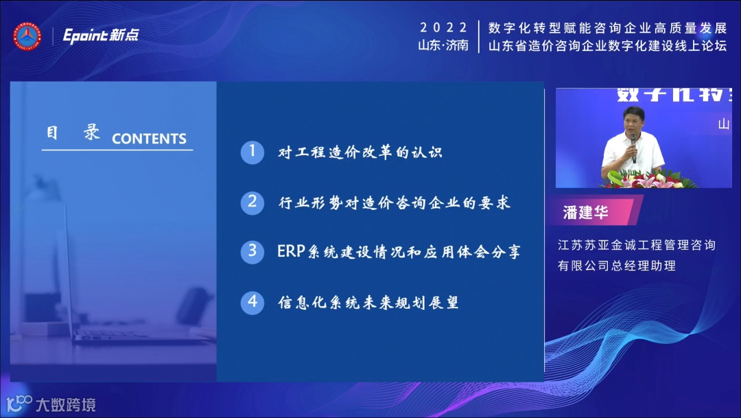江苏苏亚金诚工程管理咨询有限公司总经理助理潘建华分享了工程造价企业数字化转型的实践经验。他表示,在推行工程造价市场化改革进程中,要坚持市场在资源配置中起的决定性作用,加快构建合同计价体系,推行指标指数体系、要素价格体系,加强工程造价数据积累,从而提升改革创新成效。此外,他讲到,ERP系统高度满足企业在日常办公、合同管理、业务管理、三级校审及档案管理等多个方面的需求,精准发力,全面适应企业业务特点、满足企业数据积累的需要,加快推动了咨询企业数字化转型的步伐。