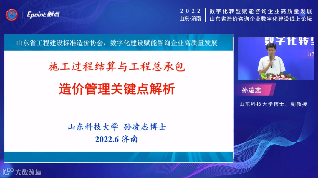 山东科技大学博士、副教授孙凌志就“施工过程结算与工程总承包造价管理关键点”进行了深入解析,他从“工程造价改革五大任务、施工过程结算管理四个认知、工程总承包造价管理六个关键点”三大方面着手,对发包阶段与费用组成、合同计价方式、合同价格形成、风险分担原则、最高投标限价以及合同价格调整与预算等要点进行深入解析,为造价咨询企业数字化发展引路。