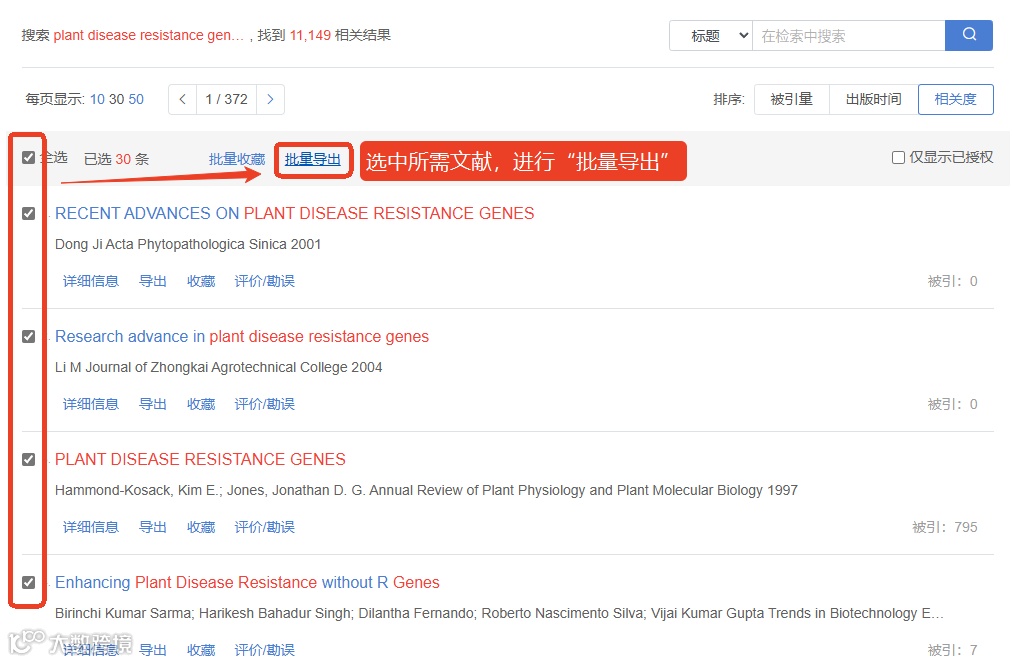 批量导出:勾选所需文献,点击“导出”,可一次性导出多篇文献的题录信息;