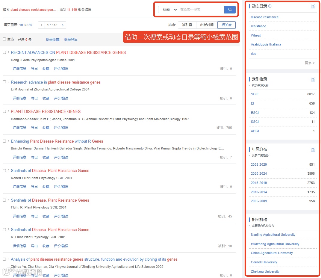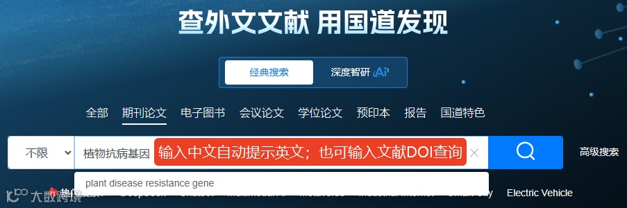 快速检索:在搜索框中输入关键词,如“plant disease resistance genes”(支持“输入中文自动提示英文”功能);