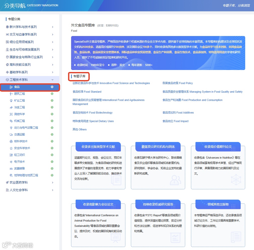 进入数据库后,点击“分类导航”,选择您所在的专题(如“外文食品专题”);